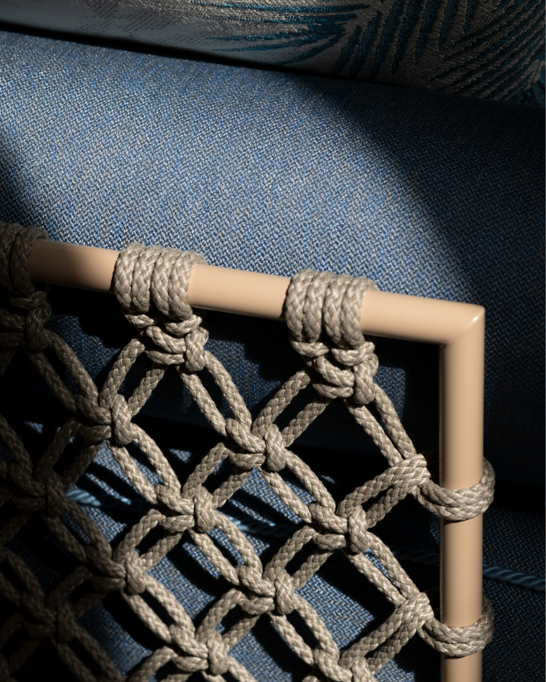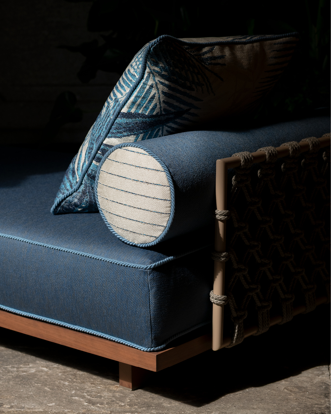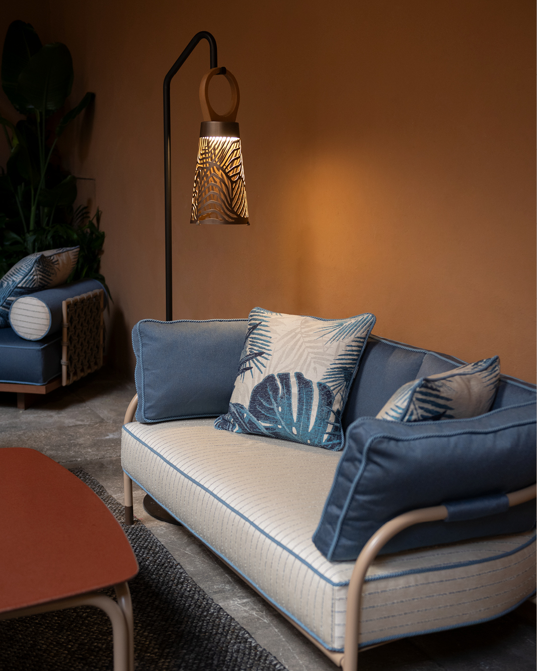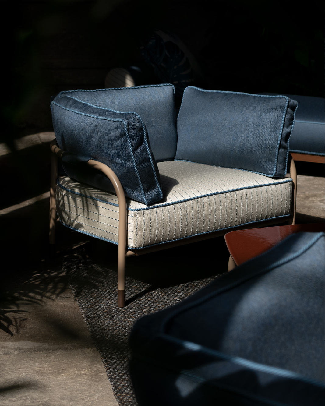 Una nuova proposta che segna il debutto della lounge chair e del divano a due posti Aliya, in dialogo con il tavolo basso Alì, firmati da Lorenza Bozzoli. Le strutture interamente metalliche, dalle linee sinuose e avvolgenti, incontrano la pietra lavica in finitura Mars Red, mentre i rivestimenti nella tonalità Blue Mirage della nuova palette trasformano la forza dei materiali in un linguaggio di calda e sofisticata eleganza.