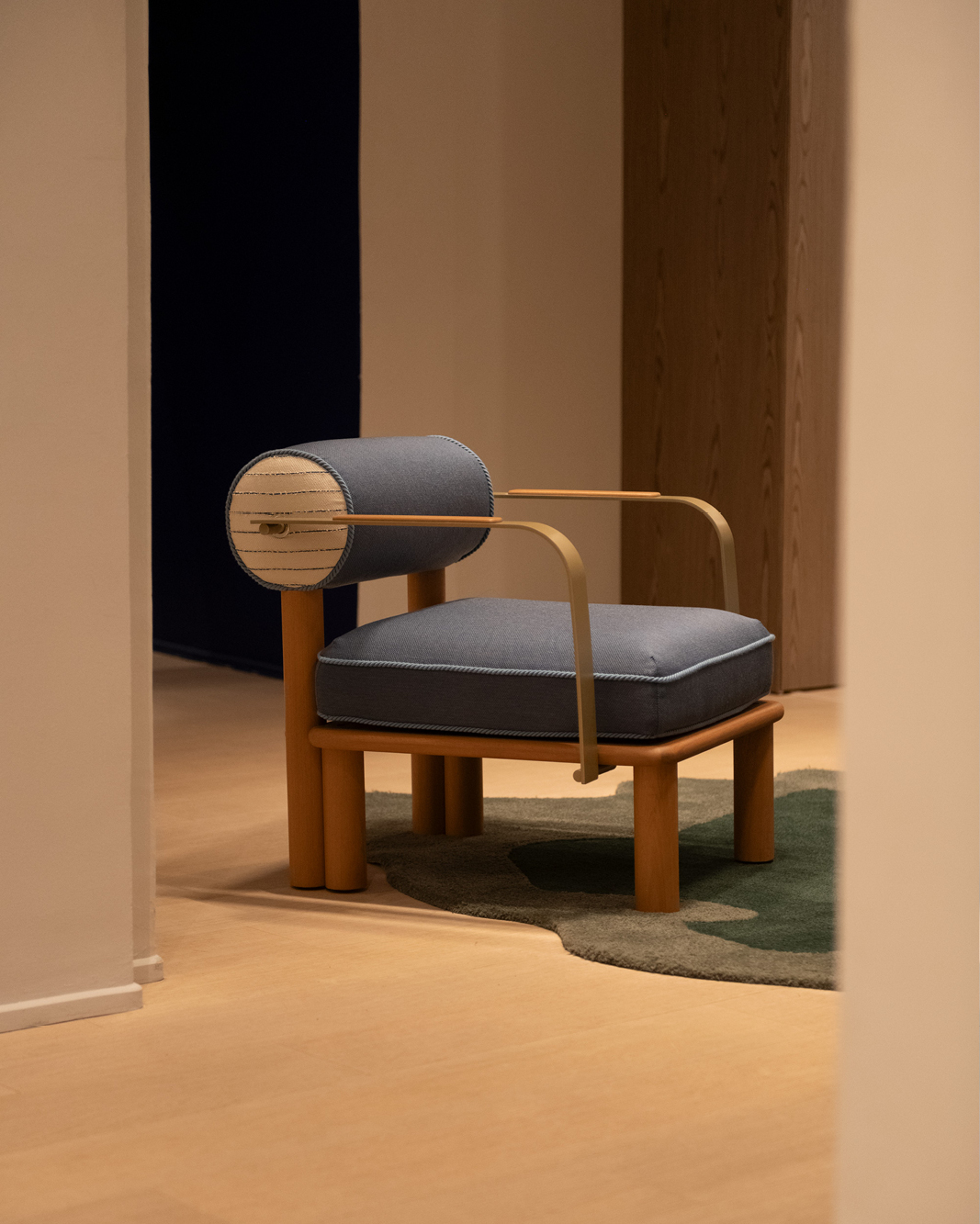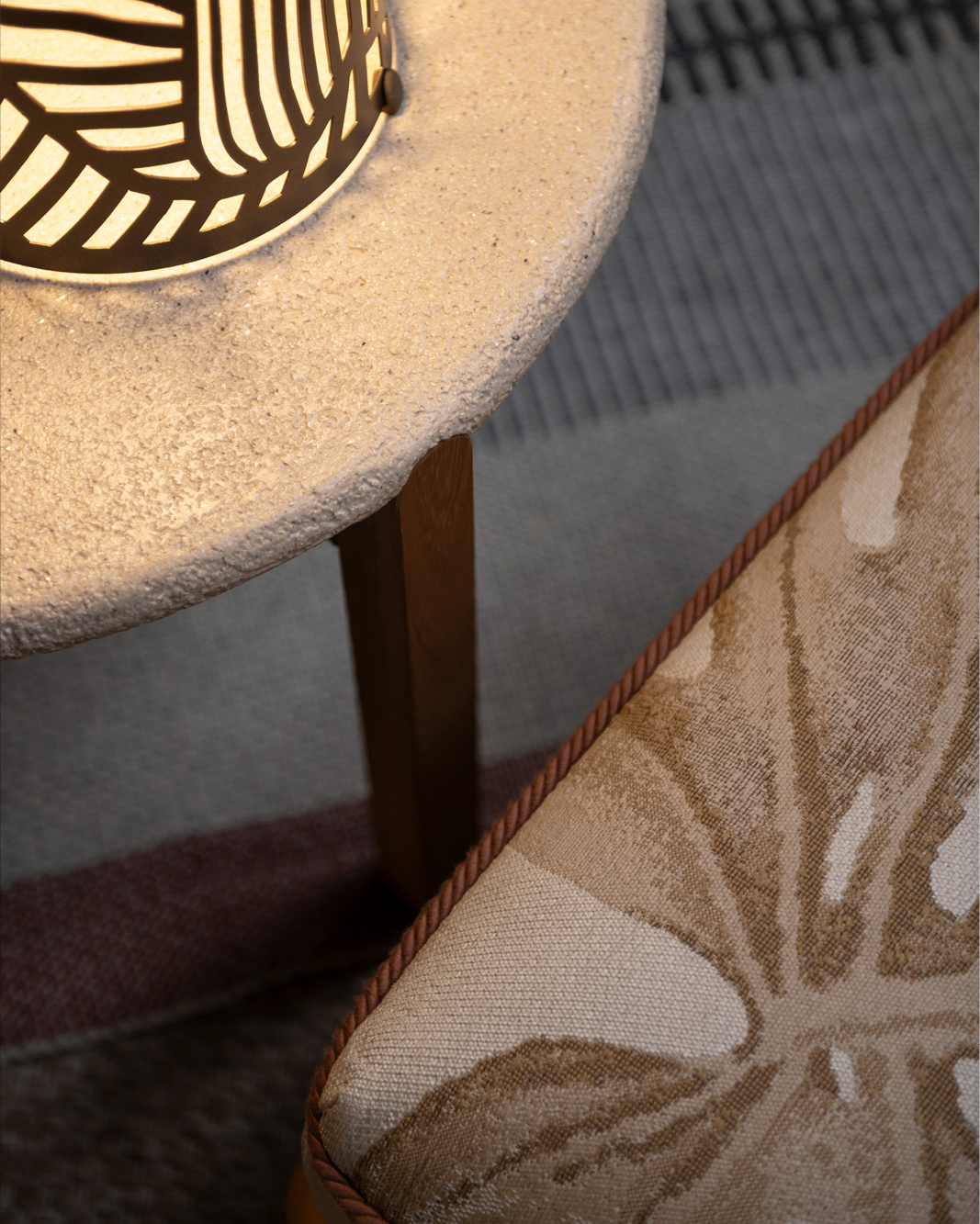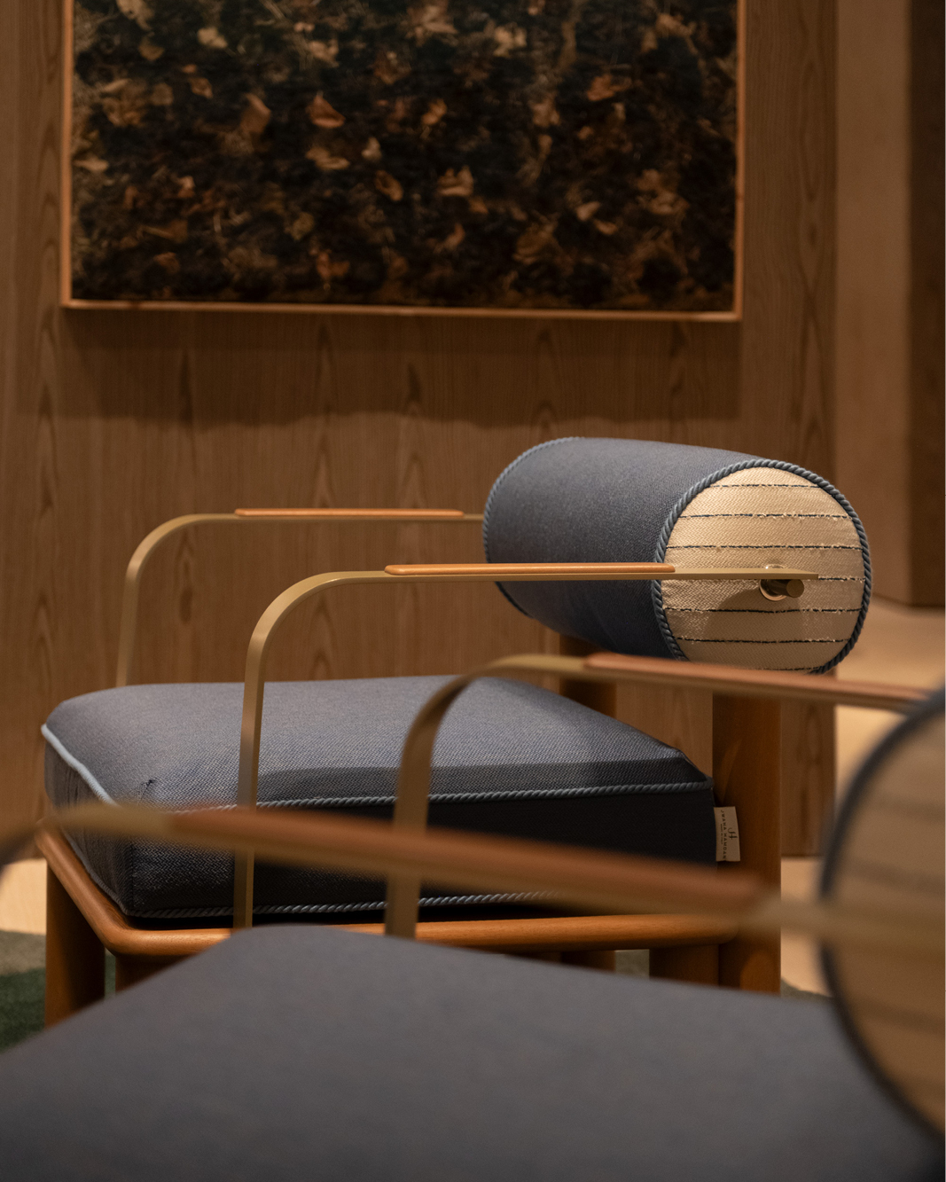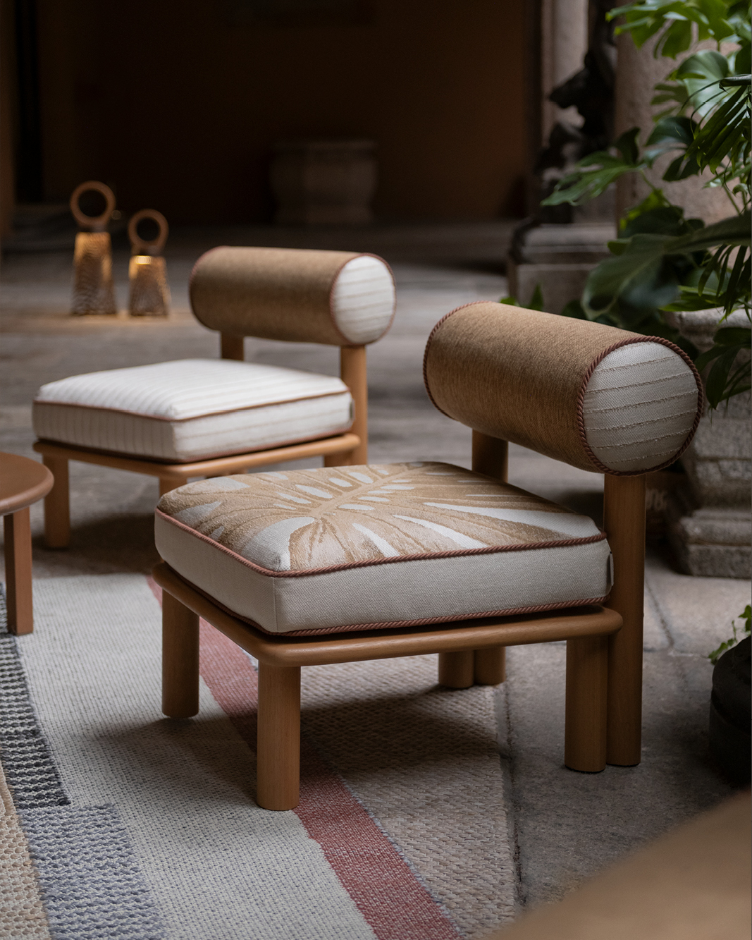 L’iconica seduta del brand sviluppata in una composizione lineare, accompagnata dalla poltroncina Maitha di Lorenza Bozzoli, entrambe rivestite nella tonalità della palette Sand Fortress e interpretate con il nuovo progetto tessile Babilonia. Un insieme che racconta l’essenza conviviale e rituale del marchio.